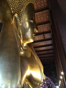 Nachdem wir unsere nähere Umgebung ausführlich erkundet hatten, machten wir uns auf den Weg zum ersten Tempel. Wir schauten uns als erstes Wat Pho an. Diese Tempelanlage fand ich sehr beeindruckend, die vielen kleinen und größeren Statuen, die Details der Verziehrungen. Das absolut besondere an dem Tempel ist jedoch der riesige liegende vergoldete Buddha. Dieser füllt ein komplettes Tempelhebäude aus!