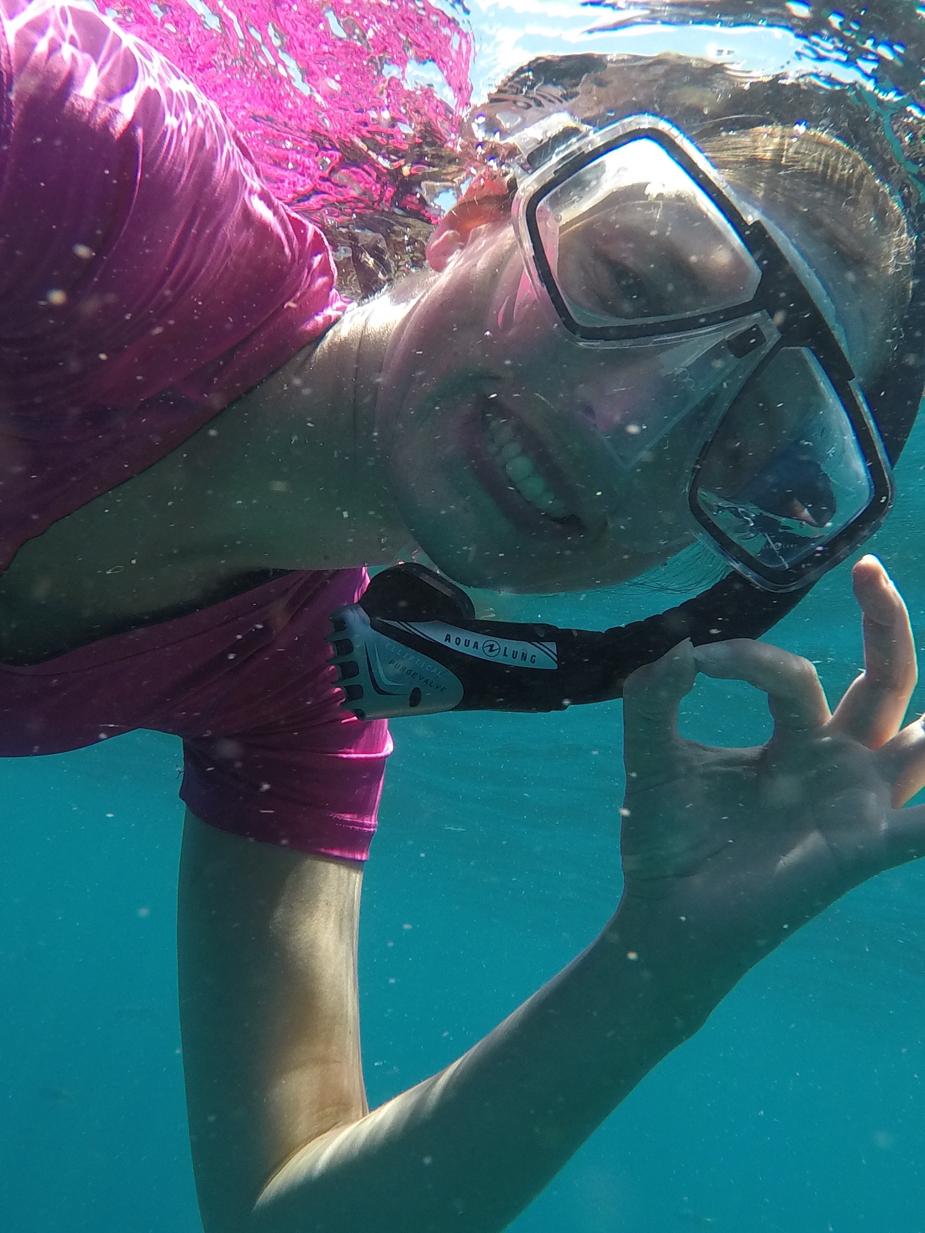 Bei Mango Bay wurde ich fast zu Fischfutter. 😉 Ich schwamm in einem Schwarm von kleinen Fischis und versuchte für ein Foto so still wie möglich zu halten. Da dachte doch ein Fisch, dass ein Muttermal nah an meiner Achsel etwas essbares wäre und zwickte mich ordentlich, so dass nicht nur der Fisch sondern auch ich ziemlich erschrak. Das Foto dazu ist auch mega lustig und ich möchte euch das natürlich nicht vorenthalten.