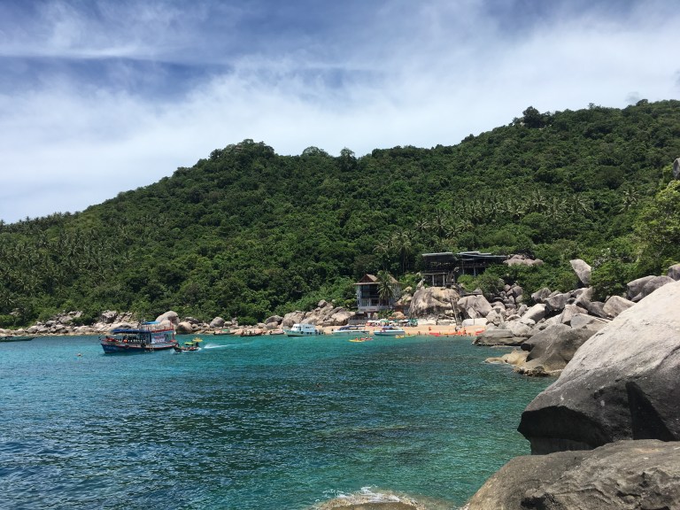 Nachdem wir unsere Tauchkurse beendet hatten, stand für uns erstmal ein Standortwechsel auf Koh Tao bevor. Ich wünschte mir an meinem Geburtstag nach der spartanischem Unterkunft der Tauchschule ein schönes Plätzchen. Wir wechselten vom Sairee Beach zum südlichen Zipfel der Insel. Direkt an unserem Hotel, welches am Hang lag, war ein kleiner Strand fast ganz für uns alleine und ein paar Meter weiter zu Fuß war die Chalok Baan Kaok Bucht und der Freedom Beach.