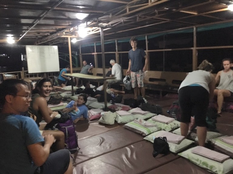 Erst als es schon dunkel war, sind wir auf das Boot gegangen, auf dem wir die nächsten zwei Tage und Nächte verbringen sollten. Joachim und ich schliefen zusammen mit 17 anderen auf dem Deck. Hier wurde abends immer ein Lager aus Matratzen aufgeschlagen. Es gab auch noch Kabinen unter Deck, hier kamen noch weitere Passagiere unter.