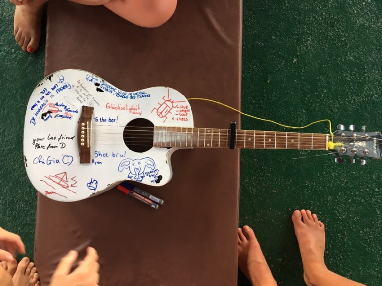 Bevor wir aber endlich zum Boot kamen, gab es am Perama Docking noch eine kleine Pause mit Essen und wir lernten einen traditionellen Tanz und spielten mit den Kindern Hulahoop und Stelzenlaufen.