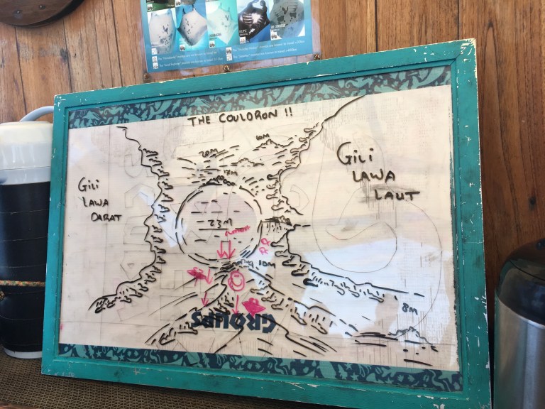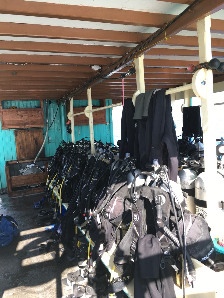 Man fährt von Labuan Bajo aus in zwei Tauchgebiete, das sind immer Tagesausflüge mit drei Tauchgängen, da man bestimmt schon 1,5-2 Stunden bis zu den Tauchspots unterwegs ist. Entweder fährt das Boot nach Central Komodo oder in den Norden. Beide Tauchgebiete sind im Komodo Nationalpark, also geschützte Gewässer. Eine weitere Besonderheit ist hier, dass hier zwei Ozeane aufeinandertreffen, was zu ordentlich Strömung führt. Durch diese Eigenschaften zählt Komodo zu einem der besten und schönsten Tauchgebiete der Welt. Im Norden kann man nur mit dem Advanced Open Water (AOW) tauchen, den ich ja auch auf Koh Tao gemacht habe, aber an dem ersten Tag wollte ich erstmal im Central Komodo tauchen, da ich ja auch noch nie mit richtiger Strömung getaucht bin. Ich hatte eine gesunde Mischung von Vorfreude und Nervosität als wir zu unserem ersten Tagesausflug in das Tauchparadies Komodo Nationalpark starteten.